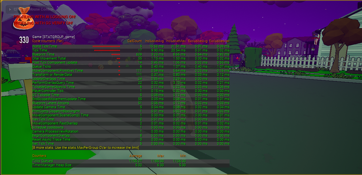 stat gameThis command lists out, in order of severity, all the tasks that your game thread is working on, the things that will most likely be highest on this list would be things like Physics, or World Tick. Move Actor is a big one as well, and often occurs within blueprints. The main thing to check here is that the longest operation here is in fact your blueprints. If your slowest operations are in Physics, you should most likely look to see how your physics could be simplified over your game code.