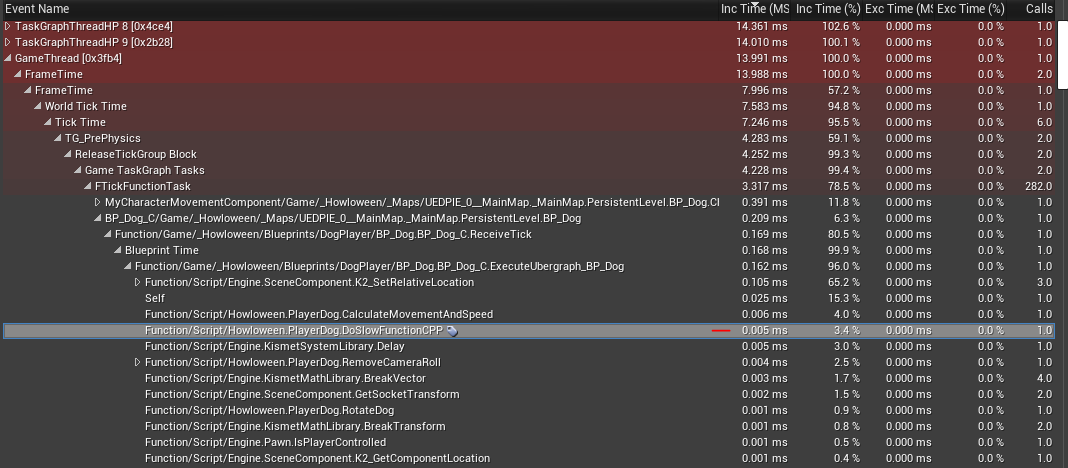 Now our blueprints are running with 7.46 ms, a great improvement from 10.52 ms! That’s about a 29% increase! The MoveComponent cut down to 48 calls with .18 ms and Blueprint time cut down from 629 calls to 120, and cuts from 3.23 ms to 1.46 ms.