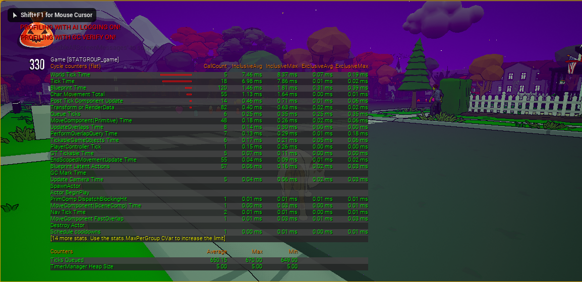 This implementation lives in blueprints via a timeline that controls the rotation and bob rate, and this plays forever, using the stat-game command, we can see more info about how long this is actually taking.