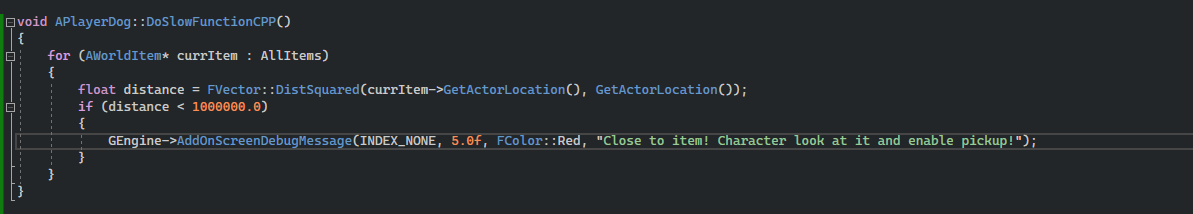 When looking to improve this, always work from the most expensive, to least, however, in this case, I will ignore the PrintString, as I want to see that info, and it won’t effect the game once it ships and is built anyway. Here, we can try and tackle the single largest function, being the GetAllActorsOfClass, we can simply fix this by pre-caching the list. We can also try and simplify the Distance check into a squared distance check, as squared distance is always much faster! Here we can see the current implementation: