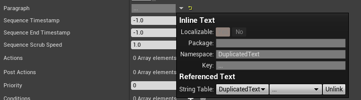 Now, with the key added to the string table, we can go back to where we found it in our asset, and once again click on the dropdown arrow. Although this time, instead of marking it as not localizable, we’ll instead, under the Referenced Text section, add the string table to reference and the key to grab the text from as such.