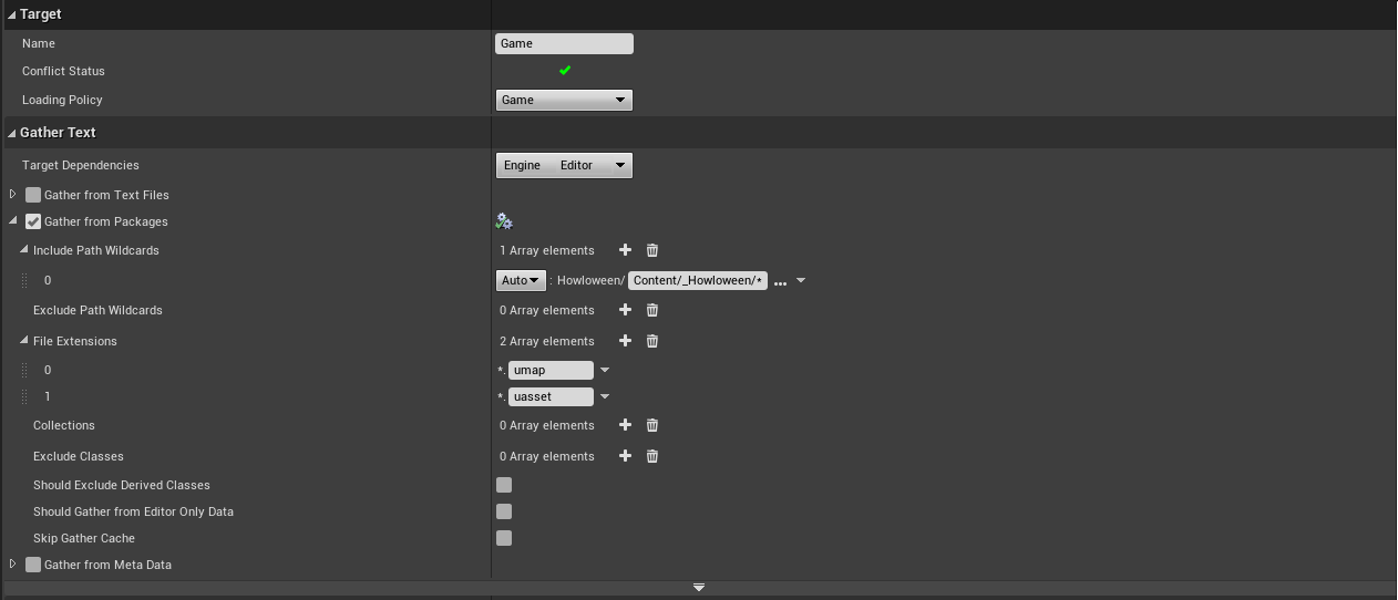 Next, we have to specify where to search for text in our game. Above the Cultures section, there is a “Gather Text” section to mess with. For any .cpp, .h, .ini or other files you will want to specify where to search for these under the “Gather from Text files” section. For any .uasset or .umap files, you will want to use the “Gather from Packages” section. In either section, you should notice a File Extensions section, which already list the extensions I listed above, if you have other files extensions to add here, go ahead and supply them. The other thing you will need to supply is the “Search Directories” or “Include Path Wildcards”, in most cases, this should be pretty straight forward, I only needed my .uasset and .umap files to be searched, and they all happened to lie within the Howloween/Content/_Howloween/ directory. So supplying Content/_Howloween/* will allow it to search down all the folders and files and sub directories within that folder.