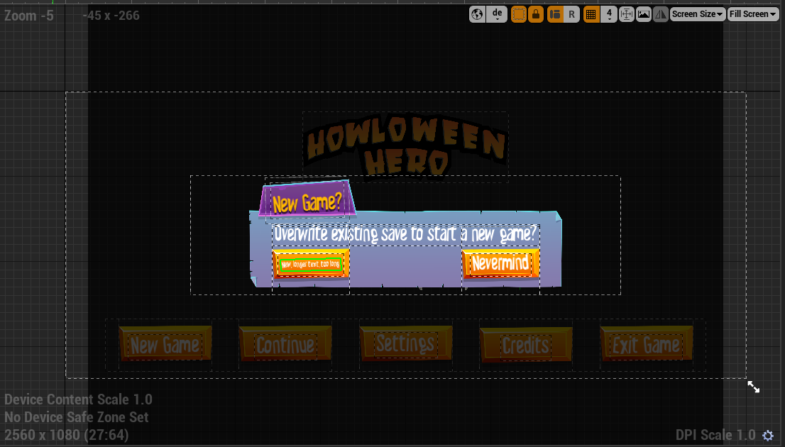 All UI that I made anywhere in this game basically follows a similar workflow, it’s a lot of work, it’s not intuitive, but it works. Whenever I seem to nest something in an overlay and share parents of similar sized items, all breaks. Here is my hierarchy, focused on this “New Game” prompt at the forefront.