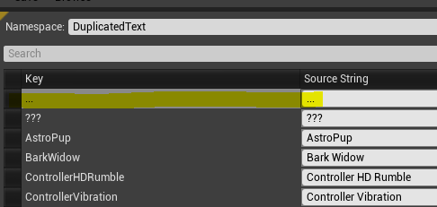I’ll call my string table “DuplicatedText” as I don’t particularly have any special need of this table other than to remove duplicates. Once you open the String Table asset, you’ll notice at the bottom you can supply a Key, and a Source String. The key is nothing more than a way for you to remember the text, and the Source String is the text that is being duplicated currently. I’ll just mark it as … for the key and … for the string and add it to the String Table.