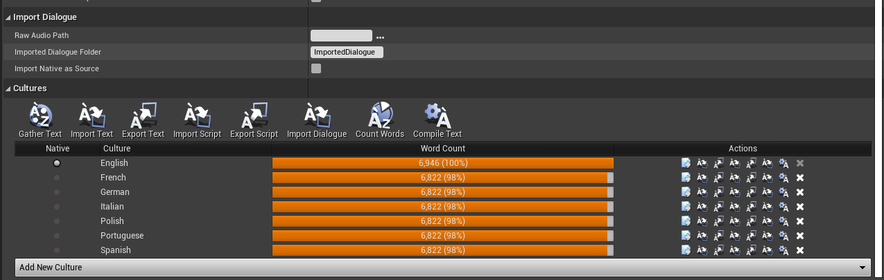 Once here, you will want to do two things, you need to specify the Cultures that you plan on supporting, and set the search paths for the engine to find your text. First, we’ll add the cultures, as that is very simple.