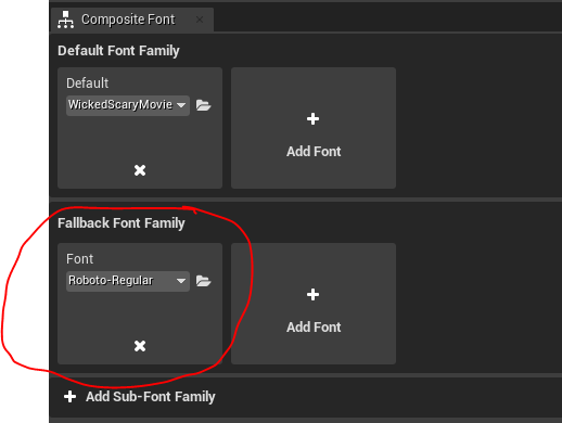 Obviously, it would be ideal to have a font that encompassed all languages, or you could update your font to include these new characters. However, that is quite difficult and time consuming to do. So, the alternate method that is much simpler is to supply a Fallback Font Family to the fonts that you use in the game. To do this, you’ll need to navigate to your font asset in your game, and then click to open it, and you should see a menu that allows you to set the Default Font Family, as well as Fallback Font Families. The simplest font to add is the Roboto-Regular font, which is already included in the engine. Click to add a fallback font, open the folder and select Roboto-Regular, import it into the game, and then make sure that it’s set properly in the font settings as such:
