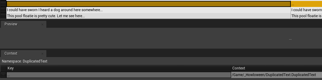 Once you find one, click on it, and in the bottom of the widow is a context view. It will give the key of the text as well as it’s context. Mine for instance shows : /Game/_Howloween/Dialogue/TrickOrTreat/ED_TOT_Vampire.ED_TOT_Vampire:BasicDialogueNode_6.paragraph