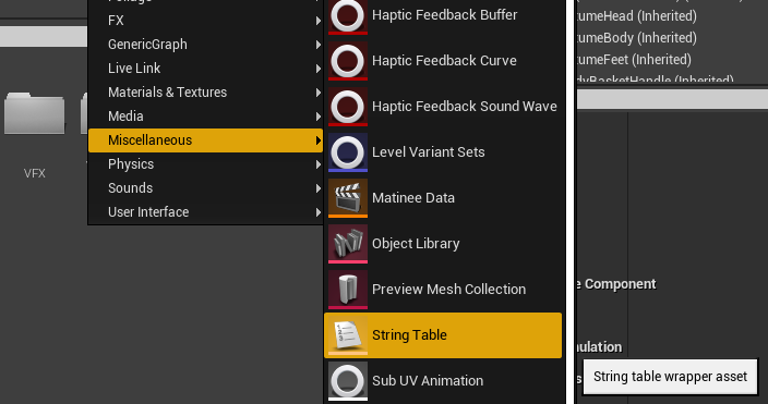 But, because that’s kind of a cop out for this case, let’s assume that I did want to localize this text, but only once, and not twice as it is currently. Well, there is an asset that you can create called a “String Table.” You can create a String table in your Content Browser by right clicking -> Miscellaneous -> String Table. Make sure to create the table in a location within the searchable directories you supplied to the Localization Dashboard earlier!