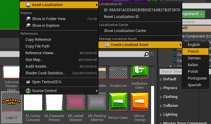 You can also localize textures or other assets in your game, did you know? If for instance, we wanted our logo localized into all the languages that we provide, we can right-click on the texture asset, go to “Asset Localization”->”Create Localized Asset”->Language and create a linked localized version of the texture. The real down side to localized textures is that the map has to reload or refresh in order for textures to update, so we opted to use as minimal textures as possible and have no localized textures, localized textures are also a TON of work, as you would need to manually create, export and import each one