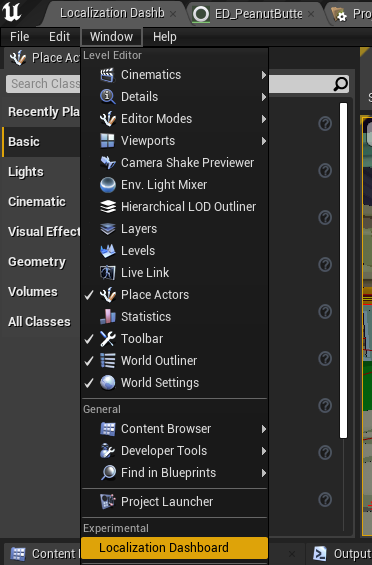 First, you will want to open the Localization Dashboard. This can be found under Window->Localization Dashboard.