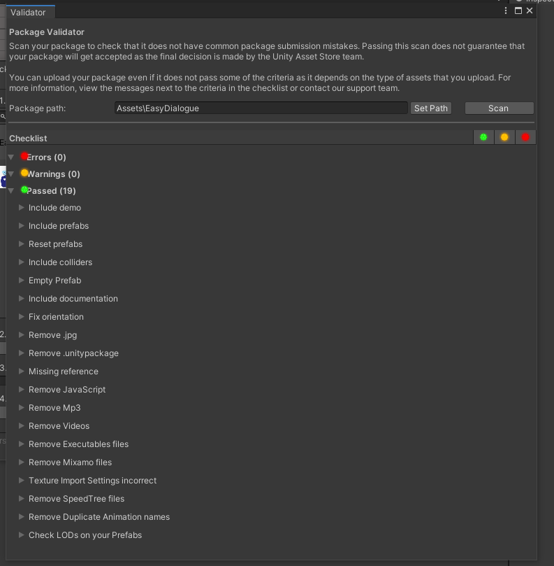 Now, I don’t know that all of these aspects are forcibly REQUIRED by Unity, but they are quite simple requests, and it should make your package better, so I would strongly recommend that you do these (and they may even be required). You need to make sure for sure that you have Documentation, a demo scene. Now like I said, it says you only NEED a demo scene, if there is something to show off, and only NEED Documentation if you have code, but I think you might as well include these things. Here is a picture of the validator that shows the things Unity is looking for in your package.